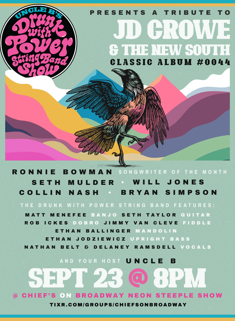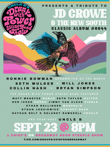 Uncle B's Drunk With Power String Band Show is Bryan Simpson's irreverent trippy-trad tent revival of a musical experience currently on residence in the Neon Steeple at Chief's on Broadway in Nashville, Tennessee.